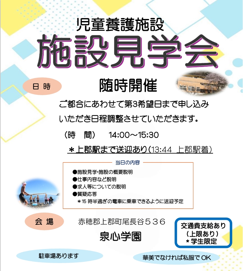 申し込み後はメールでのご連絡で対応させていただきます。申し込み後のキャンセル等もメールで可能です。見学時間は14時~15時半になります。交通費も支給(上限あり)*学生限定